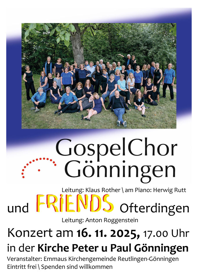 Gegründet wurde der Gospelchor Gönningen 1990. Seit 2000 steht der Chor unter der Leitung von Klaus Rother, der außerdem in der A-Capella – Formation „Pepper & Salt“ aktiv ist und uns immer wieder mit tollen Ideen, eigenen Arrangements und anspruchsvollen Übungen erfreut.